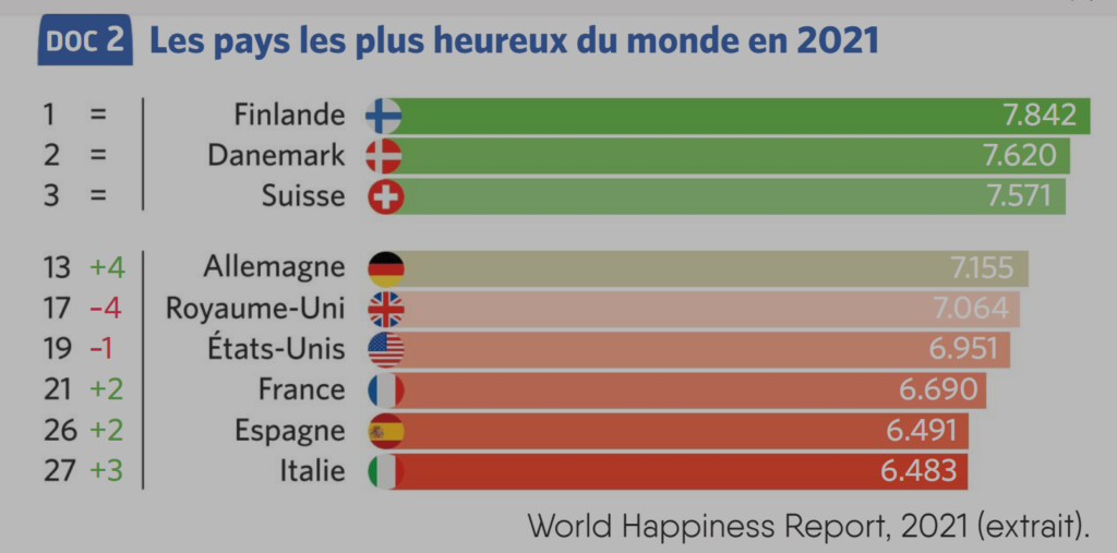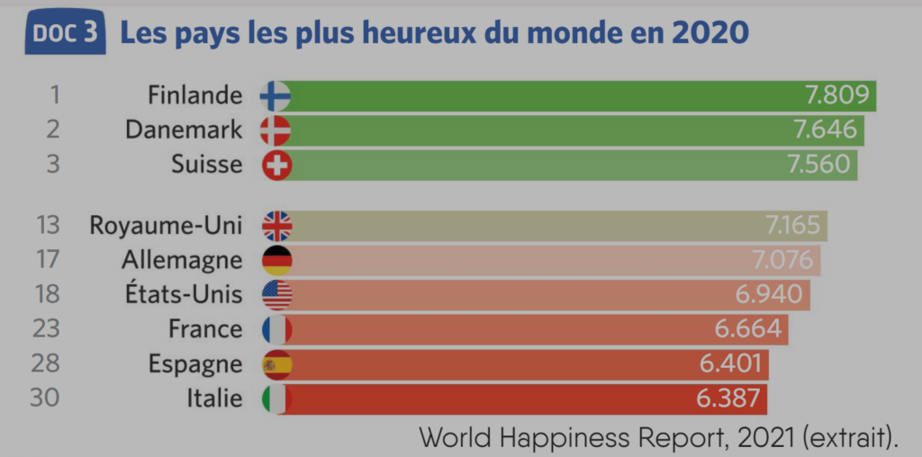 Les données des documents 2 et 3 sont calculées en fonction du PIB par Habitant, de l’espérance de vie en bonne santé, liberté, générosité, absence de corruption, niveau d’aide sociale